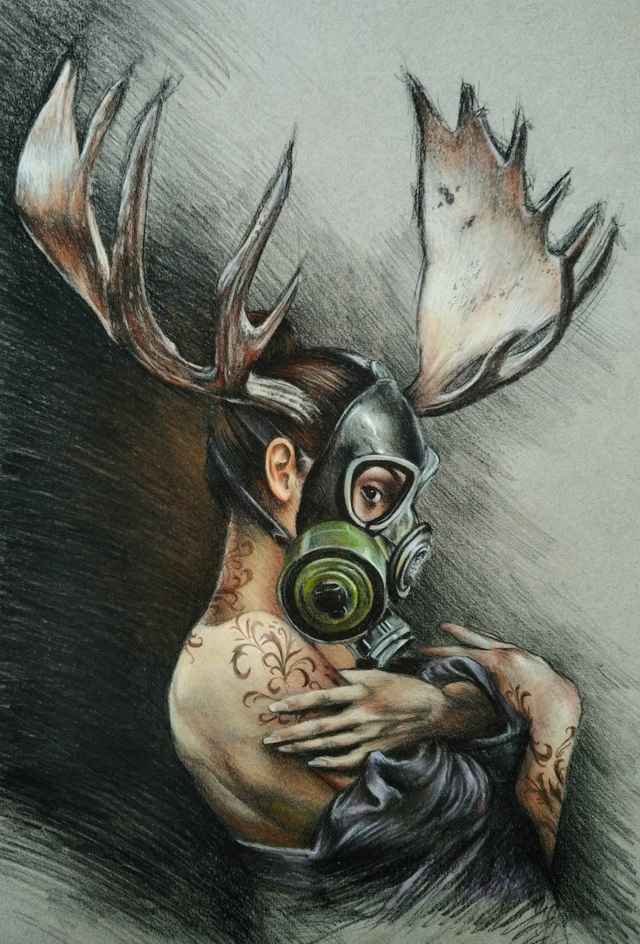 Surreal Gas Mask Tattooed Female Drawing Antler Woman Etsy Uk
