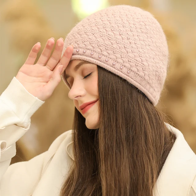 New Women Winter Hat Street Fashion Rabbit Fur Blend Warm Beanie Hat For Female Casual Pearl Decoration Knitted Hat